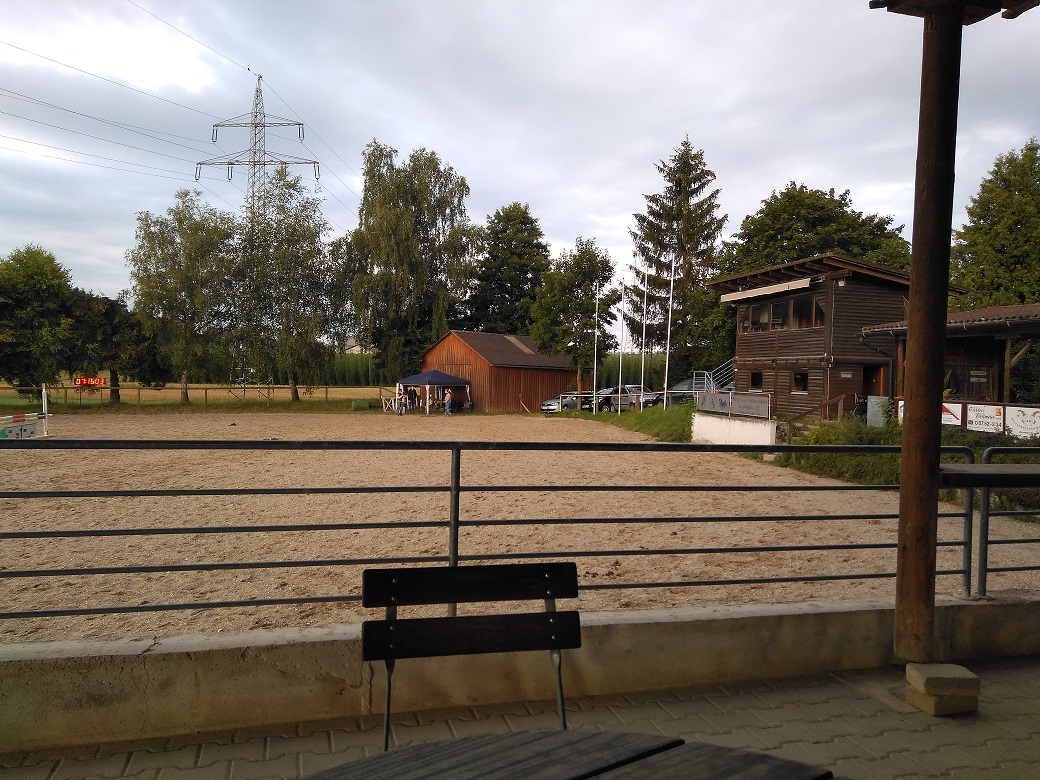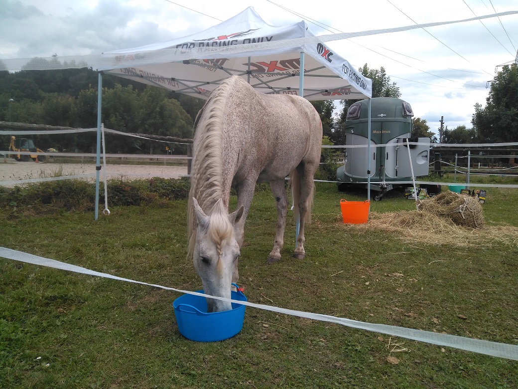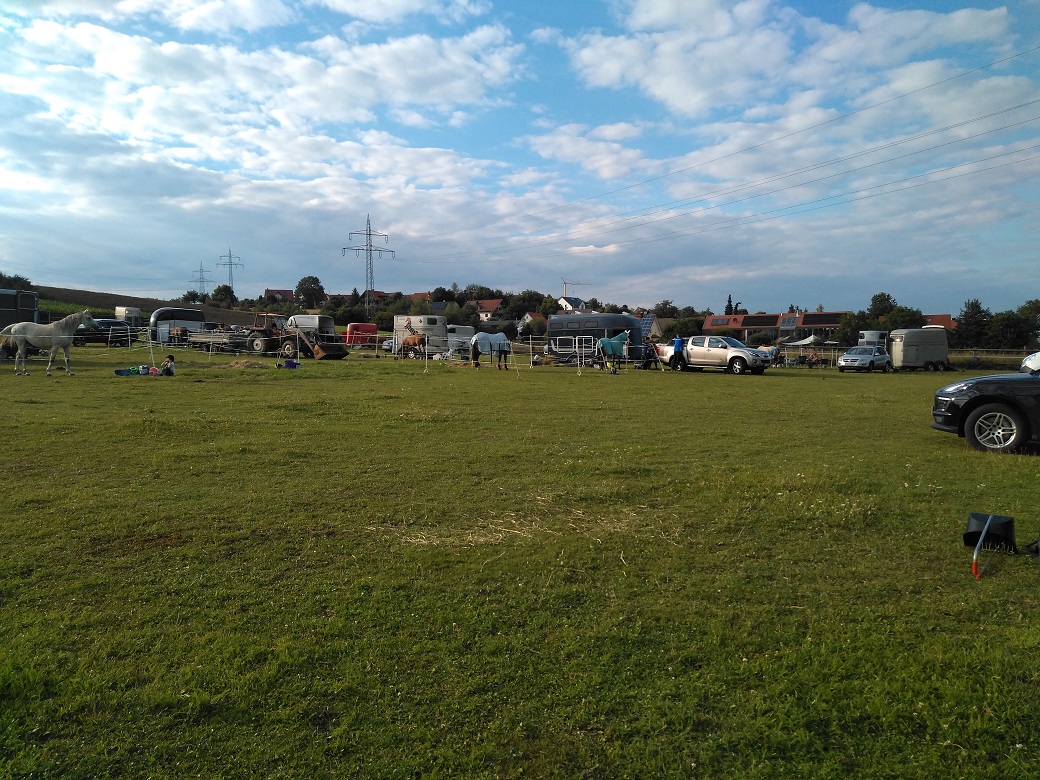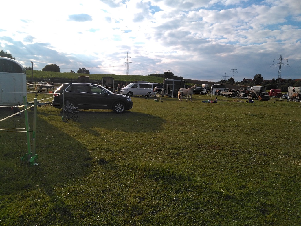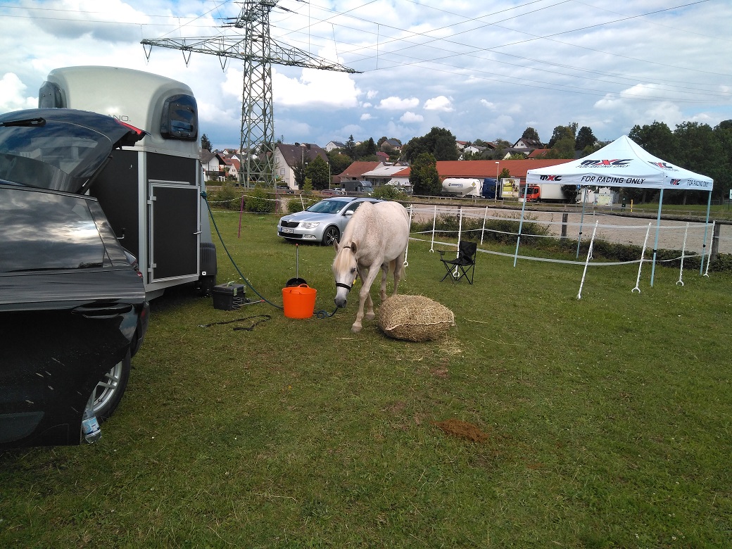 Anschließend fuhren wir zum Wettkampfgelände, dort wurde uns schon ein Plätzchen reserviert. Wie geplant kamen wir um 16 Uhr an, habe Asterix ausgeladen und angehängt, dann noch sein Zelt aufgebaut und mit dem Paddock umzäunt. Noch ein paar Meter im ihm gegangen und etwas Gras fressen lassen, aber dann ging es erst einmal ins Paddock.